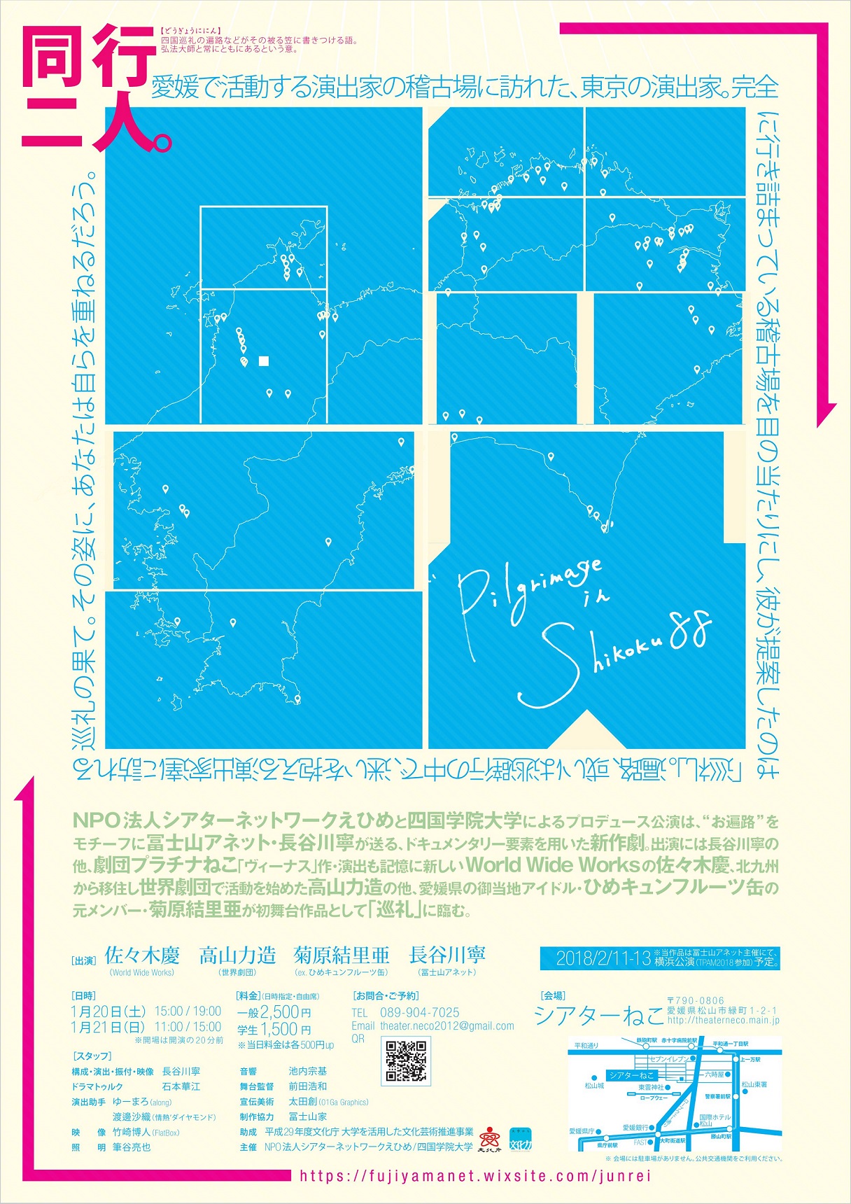 NPO法人シアターネットワークえひめと四国学院大学によるプロデュース公演は、“お遍路”をモチーフに冨士山アネット・長谷川寧が送る、ドキュメンタリー要素を用いた新作劇。